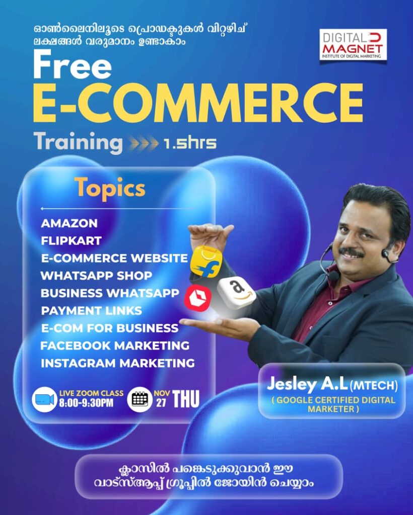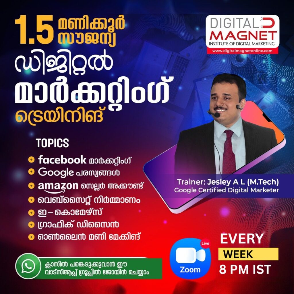 സൗജന്യ ഡിജിറ്റൽ മാർക്കറ്റിംഗ് ട്രെയിനിങ്ങിൽ പങ്കെടുക്കാൻ ഇപ്പോൾ തന്നെ വാട്സ്ആപ്പ് ഗ്രൂപ്പിൽ ജോയിൻ ചെയ്യാം